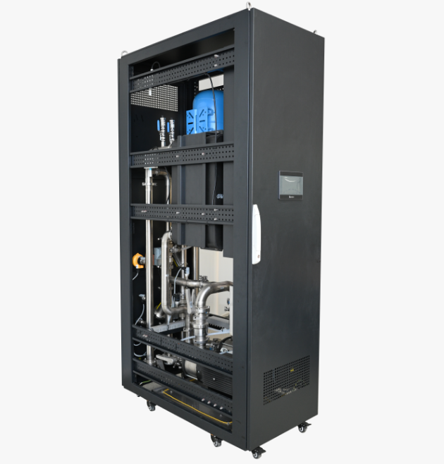包括入列式液冷CDU和机架式液液CDU。 入列式CDU主要由机箱、水泵、板换、阀、膨胀罐以及管路等组成,通过板换进行热量交换,把冷却的液体送到热源处吸收热量, 带着热量的液体再进入板换进行换热处理,循环换热,功率范围覆盖100kW~2MW。